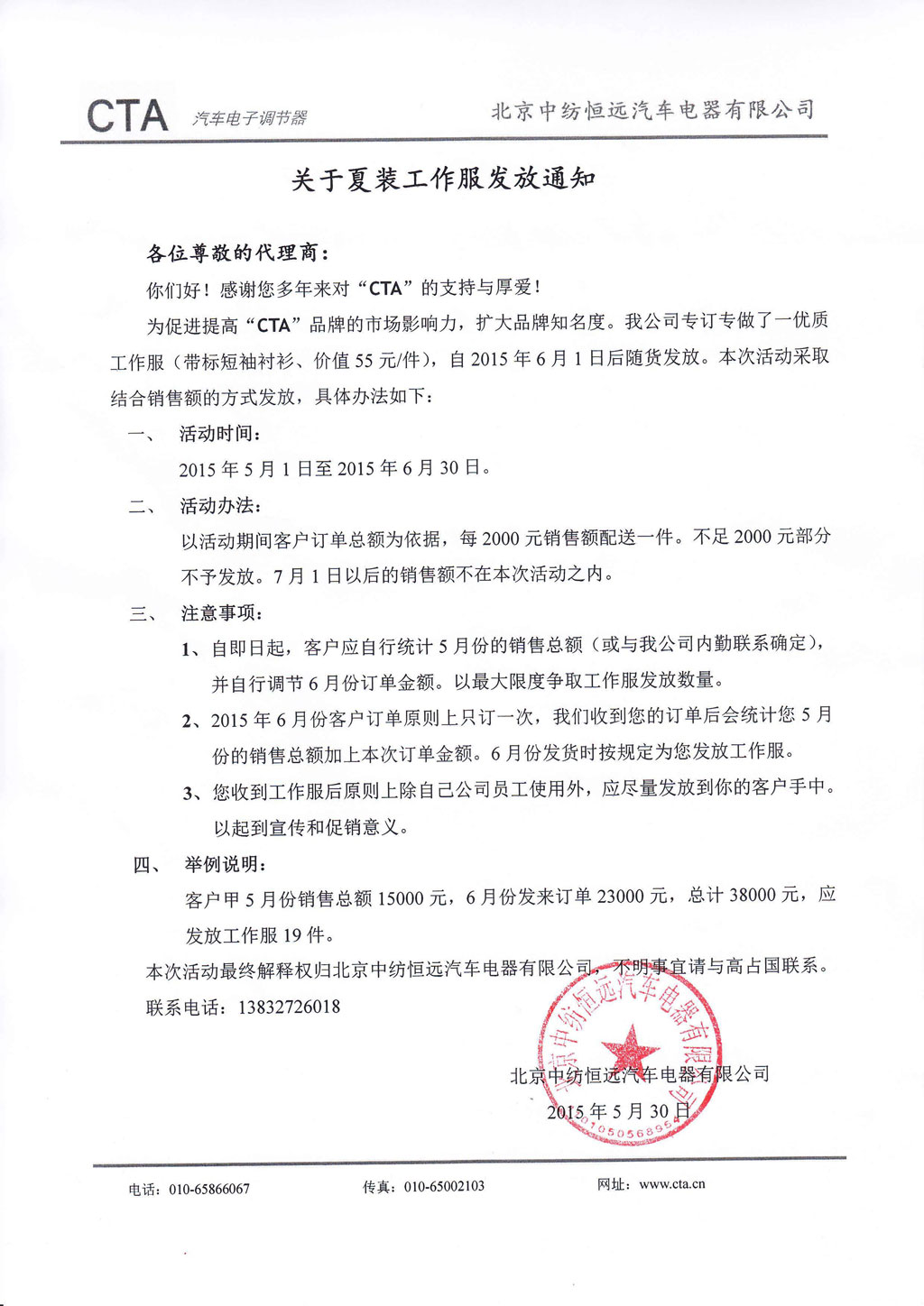 为促进提高“CTA”品牌的市场影响力,扩大品牌知名度。我公司专订专做了一优质工作服(带标短袖衬衫、价值55元/件),自2015年6月1日后随货发放。本次活动采取结合销售额的方式发放,具体办法如下: